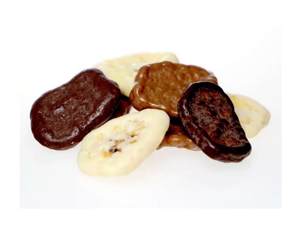 Složení: Proslazený banán plátky 50% (banán, kokosový olej, cukr, banánové aroma), mléčná čokoláda 49% (cukr, kakaové máslo, sušené mléko, sušená syrovátka, kakaová hmota, emulgátor: sójový lecitin, aroma vanilin), hořká čokoláda 49% (kakaová hmota, cukr, kakaové máslo, emulgátor: sójový lecitin, aroma vanilin), bílá čokoláda 49% (cukr, kakaové máslo, sušené mléko, emulgátor: sójový lecitin, aroma vanilin), leštící látka 1% (glukózový sirup, povlaková látka (arabská guma, šelak), aroma, regulátor kyselosti: kyselina citrónová, modifikovaný tapiokový škrob, rostlinný olej (kokosový, řepkový).