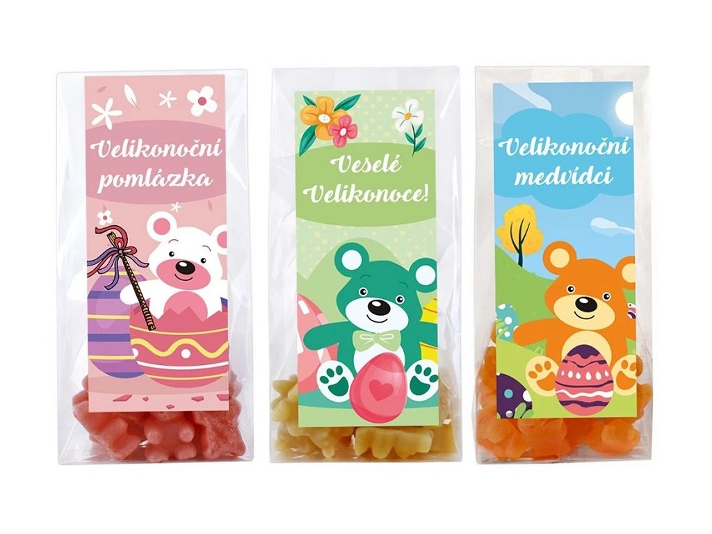 Velikonoční medvídci - složení: Cukr, glukózový sirup, želatina, voda, koncentrát ze šťávy z bílých hroznů, kyselina citronová, příchuť - rostlinné extrakty (červená ředkev, světlice barvířská), extrakt z bílého čaje, přírodní ovocné sladidlo, koncentrát jablečné šťávy, koncentrát meruňkové šťávy, koncentrát hruškové šťávy, karnaubský vosk.