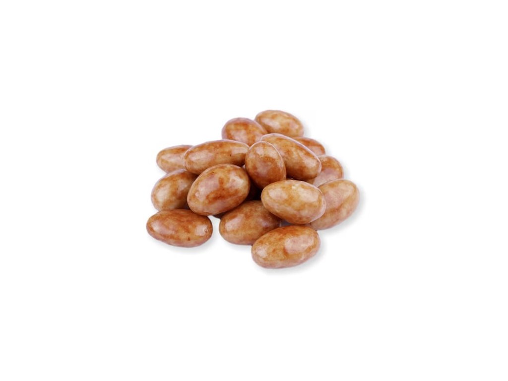 Opražené mandle obalené vrstvou bílé čokolády s jahodovým práškem.