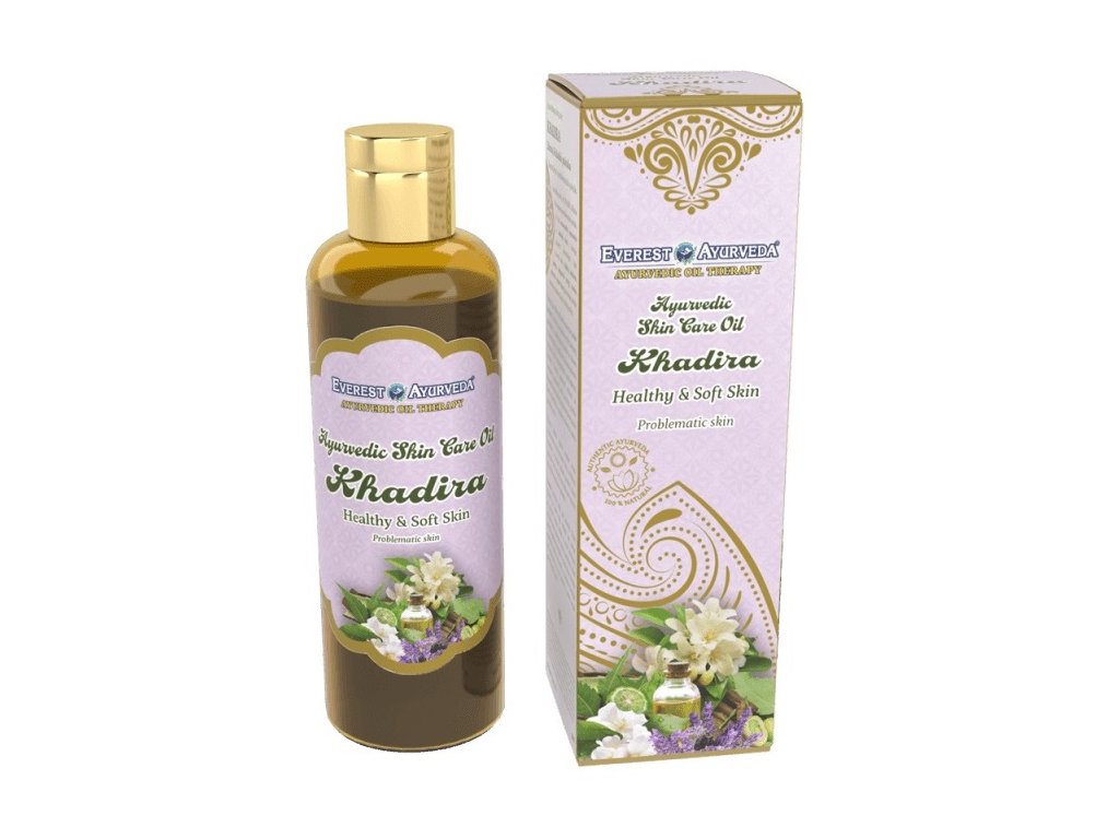 Tradiční ájurvédský olej Khadira, známý jako „kožní tonikum“, je určený na regeneraci citlivé, aknózní, podrážděné a problematické pokožky se sklonem k dermatologickým potížím. Obsahuje jedinečnou kombinaci bylin s antiseptickými a antifungálními účinky. Přispívá ke zklidnění pokožky při jejím svědění, zarudnutí, popraskání nebo poranění. Pomáhá minimalizovat pigmentové skvrny, ochraňuje kožní mikroflóru a prospívá celkovému zdraví kožní tkáně.